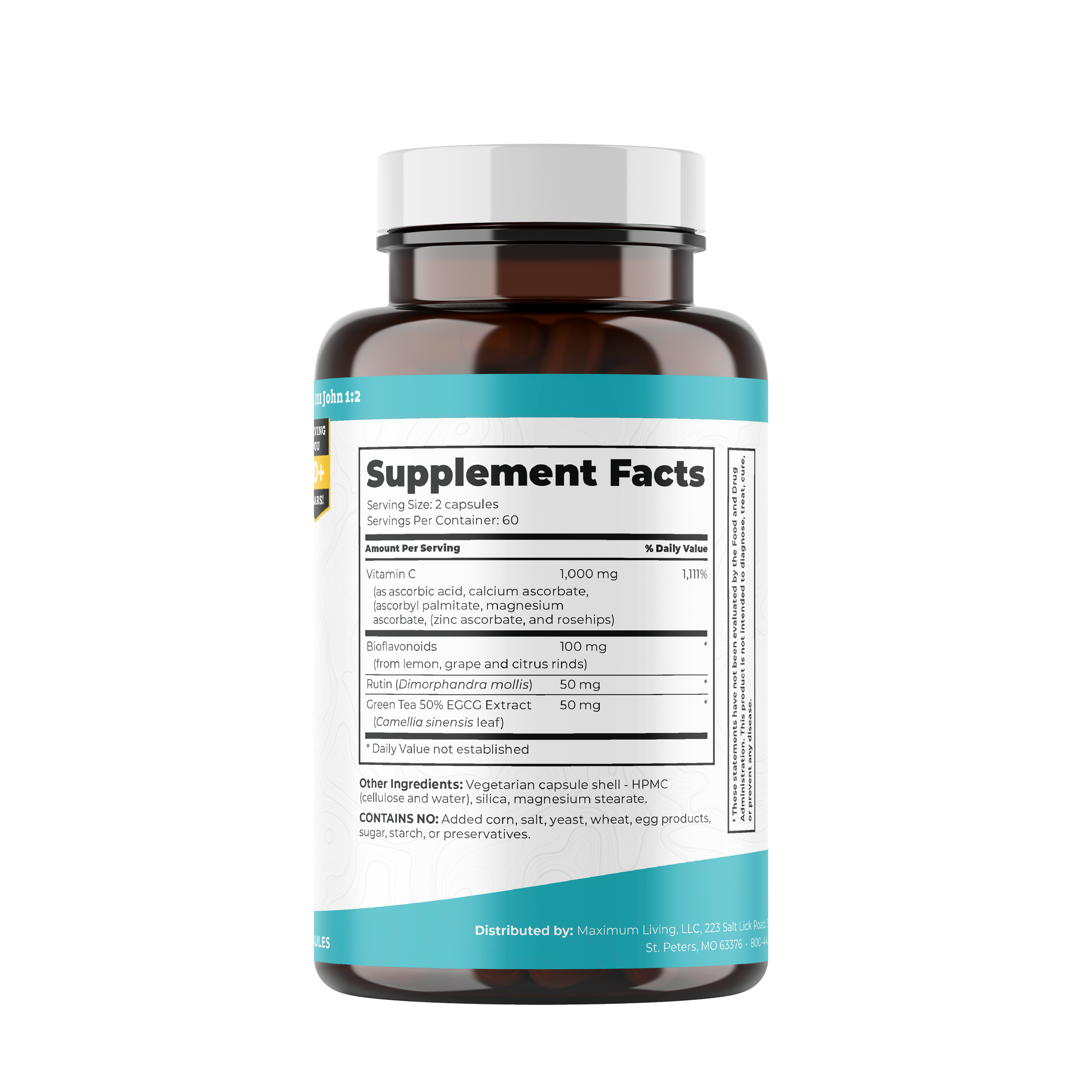 - Contains 1000mg of 5 different sources of Vitamin C, 100mg Bioflavonoids, 50mg Rutin & 50mg Green Tea